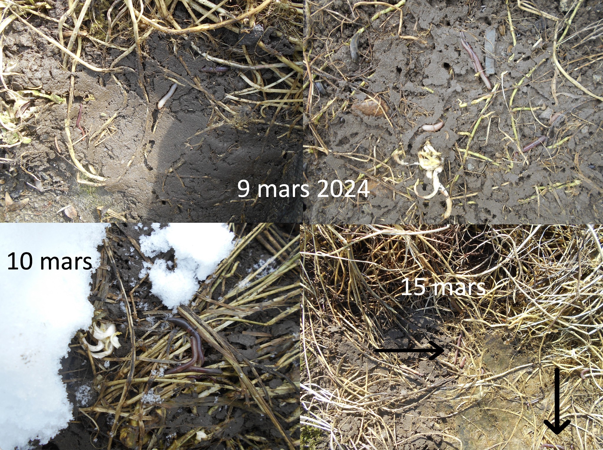 Comparé à mon tas à la maison contenant en majorité L. terrestris et quelques endogés présentés dans la publication du 24 mai, j’ai observé (ainsi que de nombreux cocons) en 4 visites depuis 3 semaines dans le tas à l’INAB, 99% d’Eisenia fetida, (voir photos), que les anglophones nomment le ver du fumier ou le ver à compost, et 3 autres vers que je n’ai pu identifier. Cette espèce se reproduit très vite jusqu’à occuper massivement un compost. Elle est utilisée pour le lombricompostage. Chez moi, depuis 15-20 ans le tas de copeaux est à 20 m du compost de jardin où ils abondent, mais ils ne s’y sont jamais déplacés.