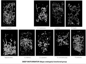Première image : Bioturbateurs de profondeur : vers de terre de grande ou moyenne taille, non pigmentés, ayant une faible activité de surface et réalisant des galeries remblayées en profondeur dans le sol. Un lien est fait avec la catégorie hypoendogée (aucune activité de surface, vivent exclusivement dans le sols) ; Octolasion cyaneum est présent au Québec.