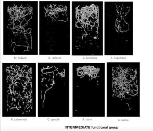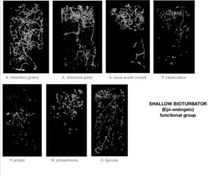 Seconde image : Bioturbateurs peu profonds ou superficiels : petits vers de terre non pigmentés ayant une très faible activité de surface et réalisant des galeries remblayées et peu profondes dans le sol. Un lien peut être fait avec l’épi-endogée de Bouché ; Allolobophora chlorotica (vert) est commun au Québec.