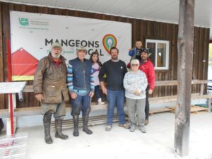 Fondée en 1992 à Ste-Geneviève-de-Batiscan, la ferme a été pionnière de la formule des paniers hebdomadaires bio il y a 30 ans. Aujourd’hui les trois enfants ont pris la relève et poursuivent l’aventure. Sur la photo, on voit Denis et Robert de retour de la collecte, Félix et ses enfants, Danielle et Charles. La 2e photo, une collecte en cours.