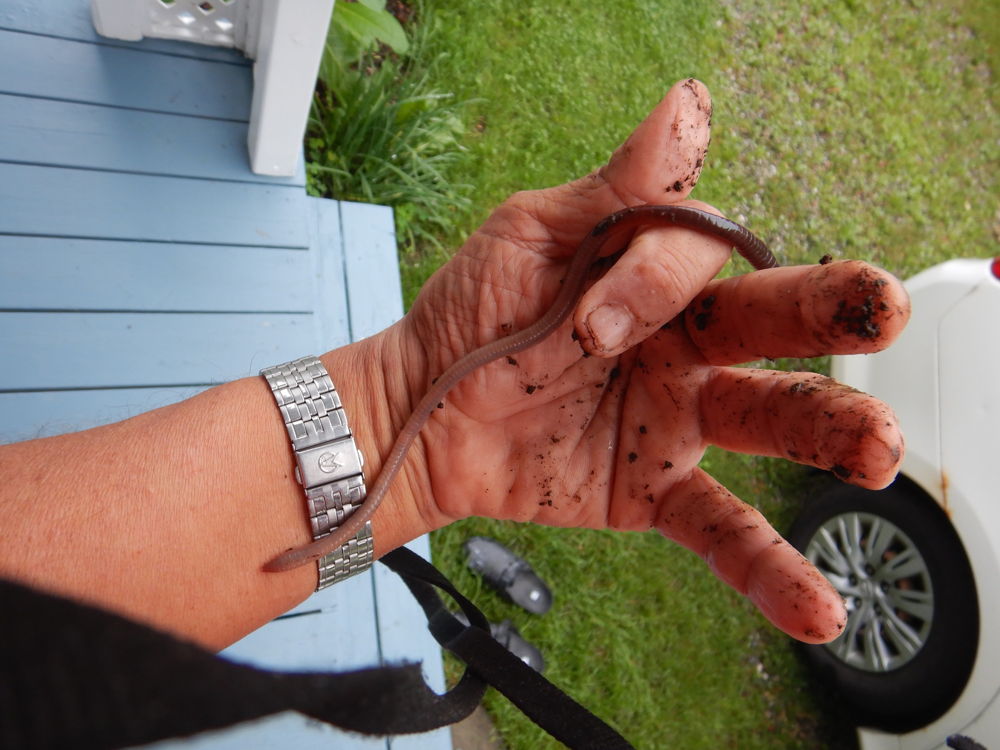 Sur la photo, un grand lombric, Lumbricus terrestris, l’espèce la plus connue en Occident. Adulte, il est facile à reconnaître parce qu’il est plus gros que les autres espèces présentes ici, sauf Aporrectodea longa presqu’aussi gros, mais qui a la tête plus foncée et la queue plus ronde. Le grand lombric a tendance à avoir la queue aplatie.