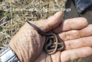 Au Québec, on a deux espèces d’anéciques : Lumbricus terrestris, le grand lombric, passablement répandu et bien connu, et Aporrectodea longa, le ver à tête noire, peu commun. Les premiers sont bien présents dans mon jardin où j’ai identifié 14 des 21 espèces de vers connues au Québec. Je voulais introduire les seconds pour voir s’ils pourraient s’y installer, et comment ils complèteraient le travail des grands lombrics. Comme j’en ai trouvé dans une collecte à la pluie aux jardins Bio Campanipol il y a deux semaines, je suis retourné samedi dernier en ramasser quelques-uns.