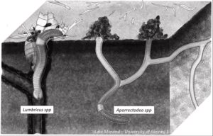 Les scientifiques travaillent à comprendre le rôle des vers de terre dans nos sols cultivés et à définir les fonctions qu’ils y effectuent. Sans pouvoir établir un lien direct avec ces fonctions, on classifie les vers de terre depuis 50 ou 60 ans selon un aspect de leur comportement c’est à dire la zone du sol où ils se déplacent, s’alimentent, se reproduisent, défèquent, etc. Les épigés vivent dans la litière superficielle et pénètrent peu dans le sol en dessous. Ils sont plus rares en sols cultivés et travaillés. Les plus adaptés à ces sols sont les endogés qui mangent beaucoup de terre minérale, sortent parfois en surface manger ou déféquer, rejettent beaucoup de déjections derrière en avançant dans le sol mais ne pénètrent pas en profondeur. Le troisième groupe est constitué des anéciques qui circulent à la verticale et pénètrent profondément dans les sols, créant des cavités nommées biopores. Ces canaux sont très utiles, ils structurent le sol en permettant à l’eau de rentrer en profondeur dans les sols, améliorant le drainage et la rétention d’eau et la réserve disponible pour les cultures. Ils favorisent l’enracinement profond, améliorant les rendements.