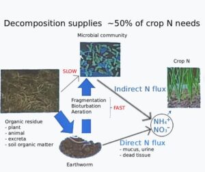 Les vers excrètent de l’urine et du mucus riche en azote directement ou rapidement assimilable par les cultures. De même pour la nécromasse de vers morts. Voir graphique « Direct N flux ». Ils fragmentent la litière, aèrent et brassent le sol par leur bioturbation, et rejettent des déjections qui seront, par la suite, colonisées par les microorganismes du sol : l’action des vers accélère la fourniture d’azote aux cultures par les microbes (V. graphique : flux indirect).