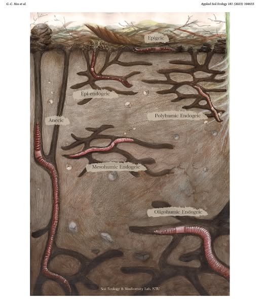 Les endogés, (ex. A. turgida, A. tuberculata), habituellement les plus abondants en sol cultivé, sont concentrés dans les premiers 20 cm et sortent peu en surface; ils agissent, entre autres, sur le cycle des matières organiques et la nutrition végétale, notamment la fourniture d’azote aux cultures. Lavelle les subdivise en poly, méso-oligo-humiques comme sur la première image (Hsu et al. 2022). Il y a aussi des espèces intermédiaires comme Lumbricus terrestris, un épi-anécique, L. rubellus, un épi-endogé; Allobophora chorotica est possiblement un épi-endo-anécique. Et une question importante : les espèces d’origine européenne ont-elles gardé ou modifié leur comportement depuis leur arrivée chez nous où elles sont beaucoup moins étudiées?
