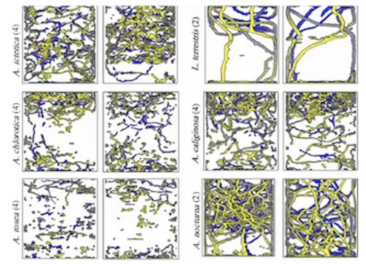 Ma photo montre un échantillon de vers en préparation pour l’envoi au laboratoire. La seconde image par tomographie (un peu floue) montre la différence des galeries entre six espèces de vers. (Capowiez)