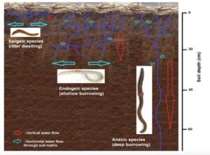 Les endogés pénètrent moins profondément même si dans des régions chaudes, on en trouve aussi en profondeur. Ils mangent beaucoup de terre et digèrent la matière organique liée au sol bien qu’ils consomment aussi les MO que l’on enfouit. Certains peuvent déposer des turricules (petites tours = un tas d’excréments) en surface, mais ils en laissent aussi un peu partout dans le sol, remplissant souvent leurs galeries, au moins partiellement, à mesure qu’ils avancent. Ils ont tendance à être plus abondants que les anéciques lorsqu’on travaille les sols.