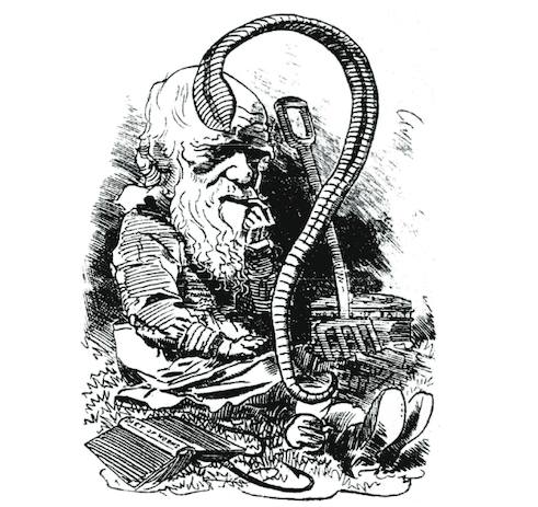 Date de publication originale : 7 septembre 2024 La caricature ‘Man is but a worm’ de Limley Sanbourne satirisant la théorie de l’évolution de Darwin, provient de l’almanach de Punch