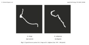 Le sol plus compact a réduit de 45% pour A.longa et de 57% pour A. caliginosa le creusage de galeries. A caliginosaavait tendance à explorer la possibilité de se déplacer latéralement comme on voit sur l’illustration alors que A. longa creusait plus directement.