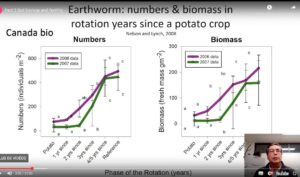 En agriculture biologique, on hésite moins à perturber le sol, mais dans les meilleures pratiques, on insère des séquences de foin en rotation avec les cultures sarclées. La présente étude de Nelson, Lynch et al, présente un suivi des populations et des biomasses de vers de terre comparées à celles de pâturages permanents. La rotation étudiée sur quatre fermes biologiques des Maritimes était pomme de terre, suivie de céréale grainée (en prairie), suivie de 3 ans de foin (fléole et trèfle rouge principalement.) La troisième année après les pommes de terre, la biomasse des vers était rétablie au même niveau que celle des pâturages permanents utilisés comme référence, et la quatrième année le nombre de vers au m2 était au même niveau.