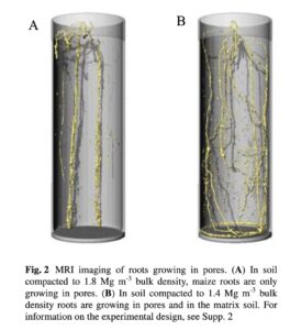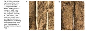 Dans un sol compact, les biopores creusés par les vers de terre suffisent-ils à faciliter l’exploration du sol par les racines? Non selon les observations de Wendel et collaboratrices, dans des pores créés artificiellement. Dans un sol compacté à une densité de 1,8 les racines de maïs n’arrivaient pas à explorer le sol hors des galeries alors qu’avec une densité modérément compactée (1,4), les racines colonisaient le sol environnant.